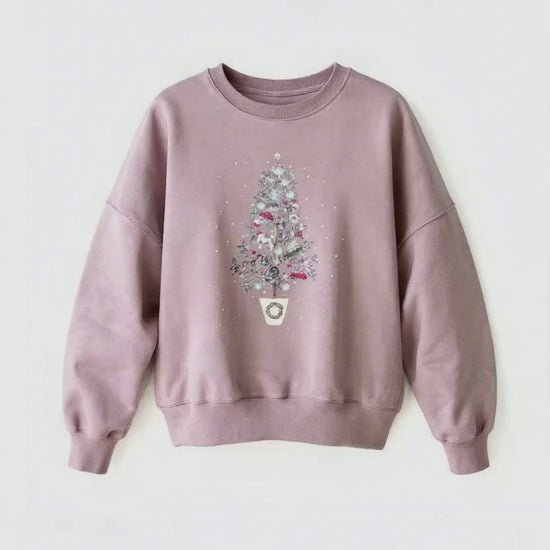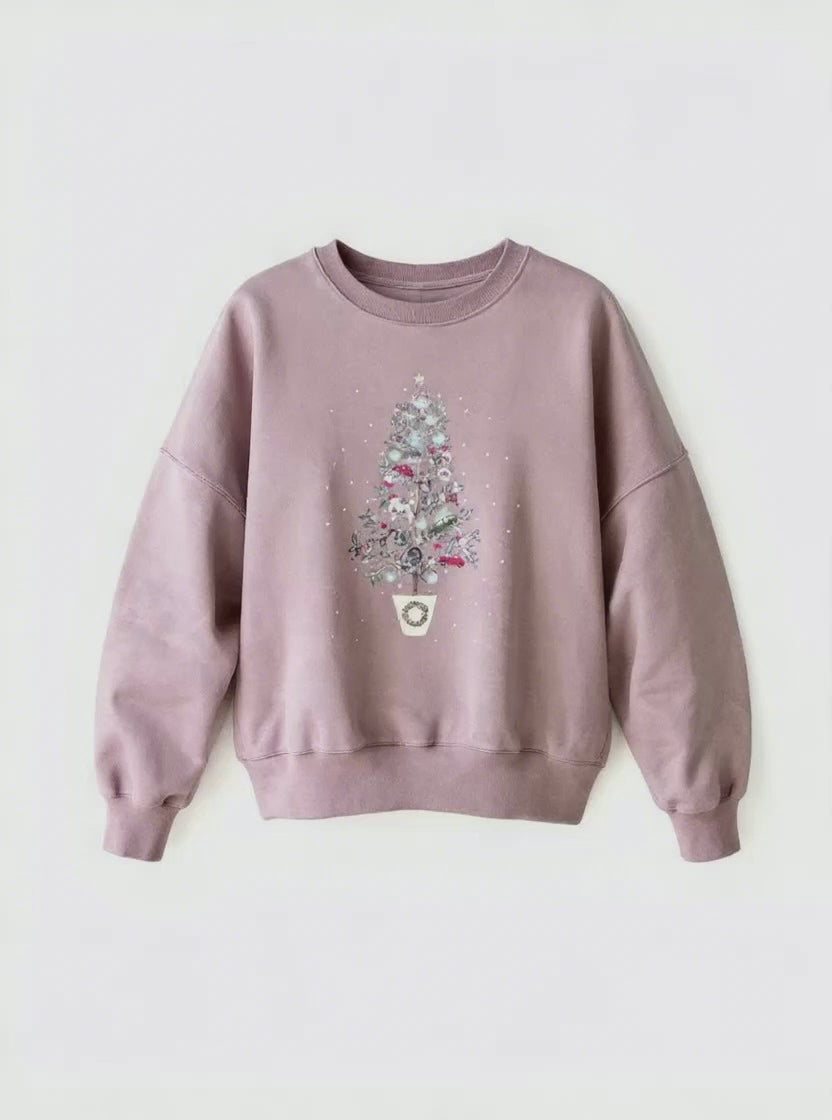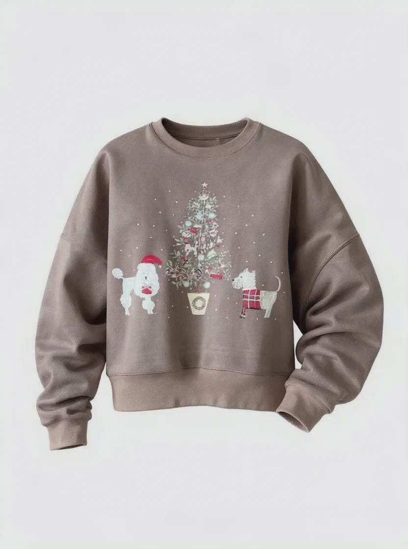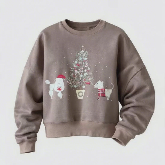 Choose between Dusty Pink, featuring a whimsical Christmas tree full of tiny festive details, or Warm Beige, with two adorable holiday pups beside a sparkling tree Both colours come in a relaxed, comfortable fit perfect for winter days.
